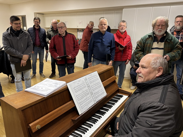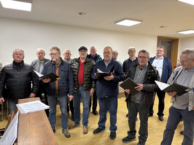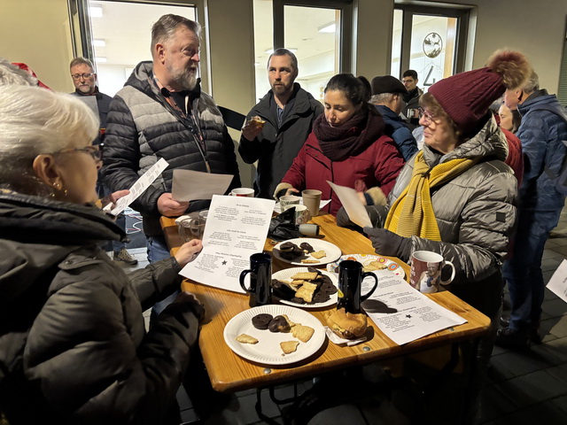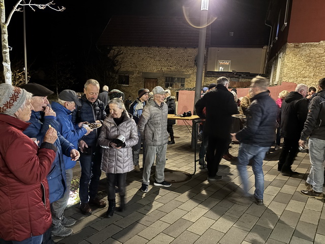 Unter den ca. 70 Personen, die nach der Chordarbietung bei „Speis und Trank“ zusammenstanden, wurden Texte von bekannten Weihnachtsliedern verteilt, die dann von allen, voller Inbrunst, natürlich kräftig verstärkt vom MGV, gesungen wurden.