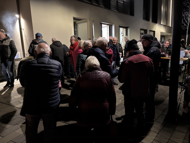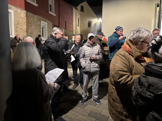 Unter den ca. 70 Personen, die nach der Chordarbietung bei „Speis und Trank“ zusammenstanden, wurden Texte von bekannten Weihnachtsliedern verteilt, die dann von allen, voller Inbrunst, natürlich kräftig verstärkt vom MGV, gesungen wurden.